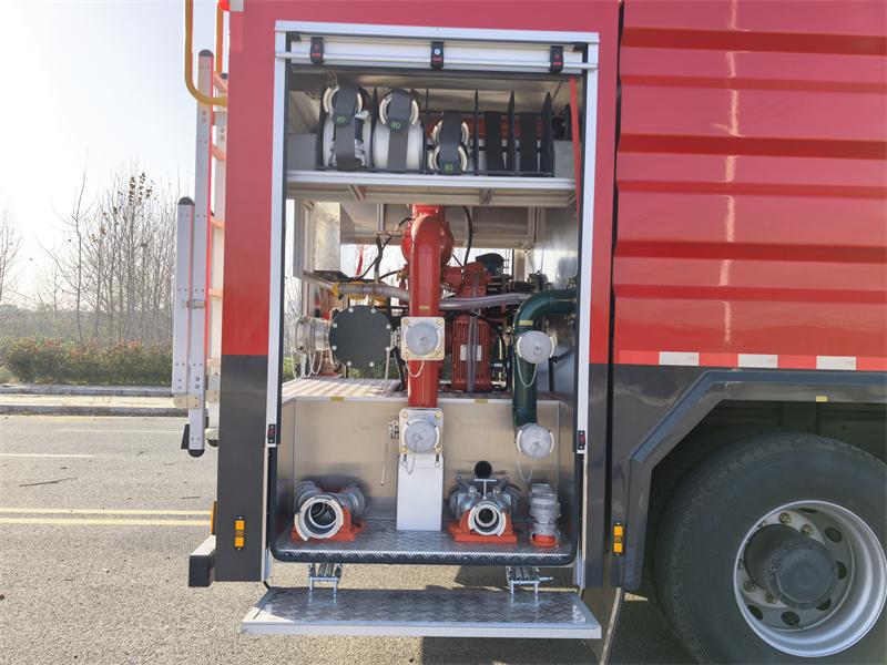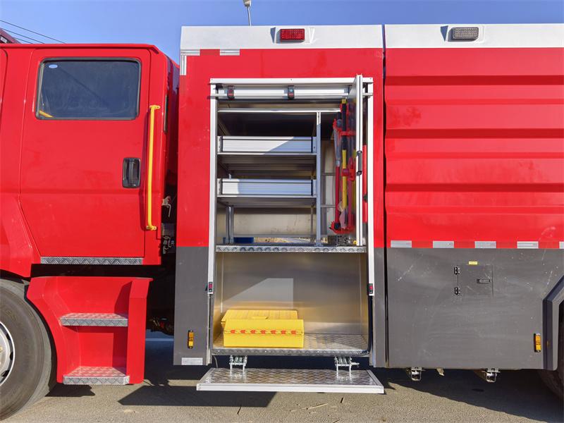 • ห้องอุปกรณ์: ห้องนี้ตั้งอยู่ด้านหน้าของโครงสร้างตัวรถ และติดตั้งชั้นวางอุปกรณ์และชั้นวางแบบดึงออกได้ ชั้นวางได้รับการออกแบบอย่างเป็นระบบเพื่อจัดเก็บอุปกรณ์ดับเพลิงต่างๆ อย่างเป็นระเบียบ (ชุดดับเพลิง ผ้าห่มดับเพลิง ปลอกสายยาง สะพานดับเพลิง เครื่องดับเพลิง ฯลฯ) ส่วนชั้นวางแบบดึงออกได้ช่วยให้เข้าถึงอุปกรณ์ที่ใช้บ่อยได้อย่างง่ายดายและรวดเร็ว เช่น ขวานดับเพลิง จอบ พลั่ว ประแจ ค้อน และเหล็กงัด ช่วยเพิ่มประสิทธิภาพในการช่วยเหลือ