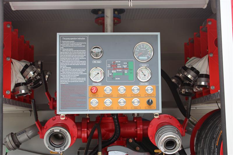 แผงควบคุม: ภายในห้องปั๊มน้ำ อุปกรณ์นี้รวมเอามาตรวัดระดับน้ำ มาตรวัดความดัน มาตรวัดสุญญากาศ มาตรวัดความเร็วรอบ เบรกฉุกเฉิน ไฟห้องอุปกรณ์ ไฟห้องปั๊ม ไฟข้าง ไฟท้าย สวิตช์เตรียมปั๊ม สวิตช์ไฟหลัก คันเร่งอิเล็กทรอนิกส์ และปุ่มอื่นๆ ไว้ด้วยกัน นอกจากนี้ยังมีคู่มือการใช้งานปั๊มดับเพลิง แผนผังท่อน้ำถังเก็บน้ำ ฯลฯ อินเทอร์เฟซใช้งานง่าย ช่วยให้เจ้าหน้าที่ดับเพลิงสามารถตรวจสอบและใช้งานปุ่มต่างๆ ที่เกี่ยวข้องได้แบบเรียลไทม์